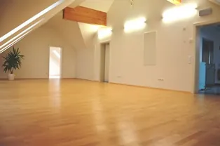 - Ausstattung: Raumhöhe ca. 3,5 m, 5 Hebeschiebetüren, Sonnenschutz–Zipscreen, 18,4 m² Balkon, Fußbodenheizung, Vinylboden, Elektro-Bodendosen, Küche (Ablöse), Dose f. Zentralstaubsauger, Türsprechanlage, Sanitärbereich m. Duschbadewanne/WC/Waschtischverbau, Spiegelschrank u. Kasten