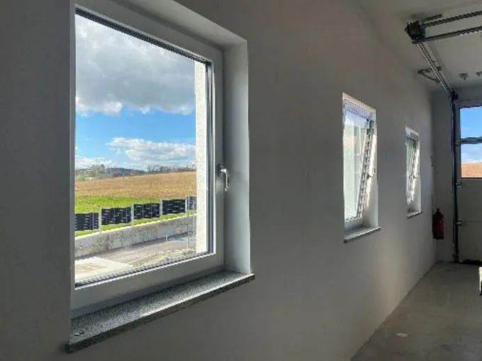 - Ausstattung: Raumhöhe 3,30 m, 2 Deckensektionaltore, 2 Zugangstüren, 3 Fenster, Betonkernaktivierung – beheizt bis max. 10 Grad (in BK-P. inkludiert), 2 Stromverteilerkästen, Feuerlöscher, Strombelastung max. 25 Ampere
